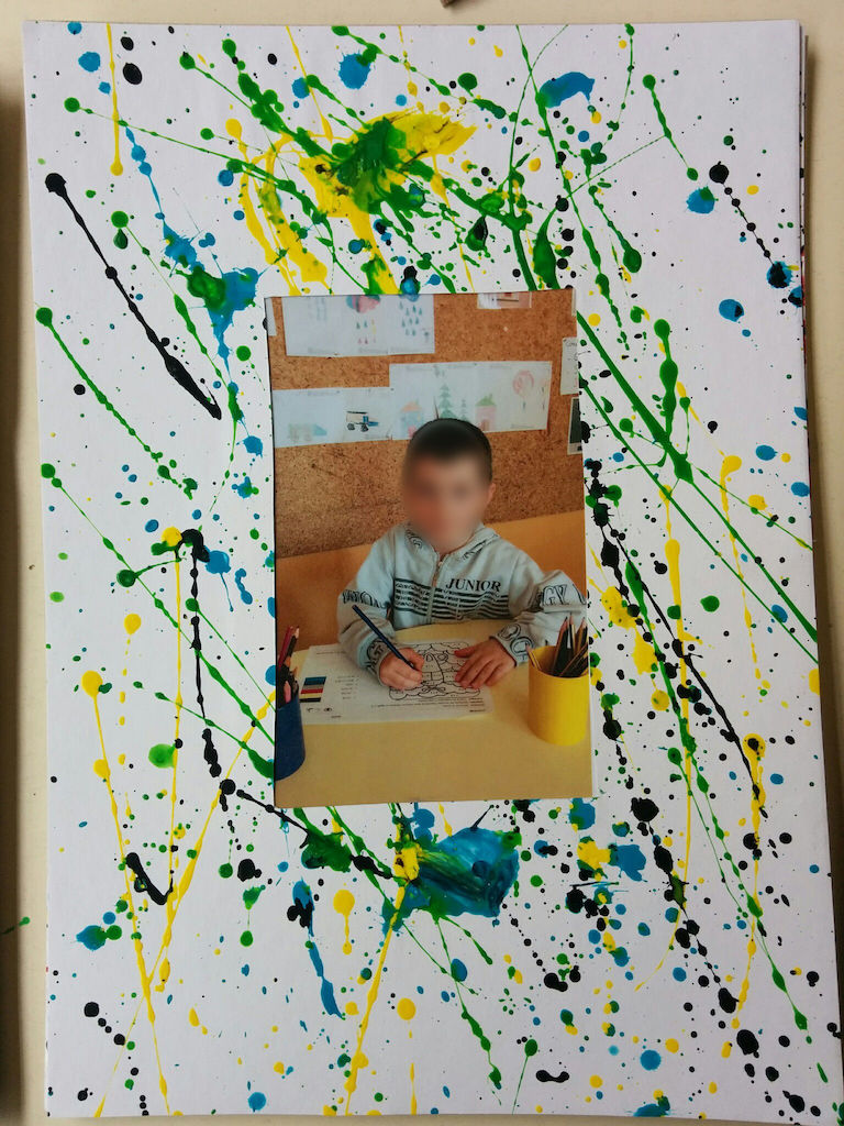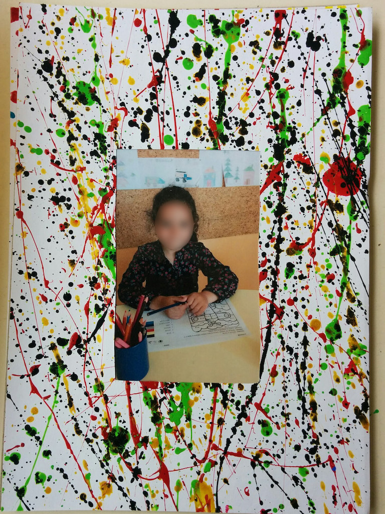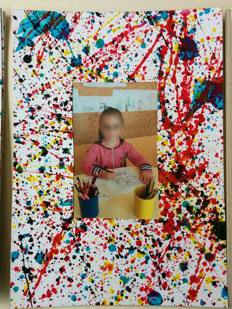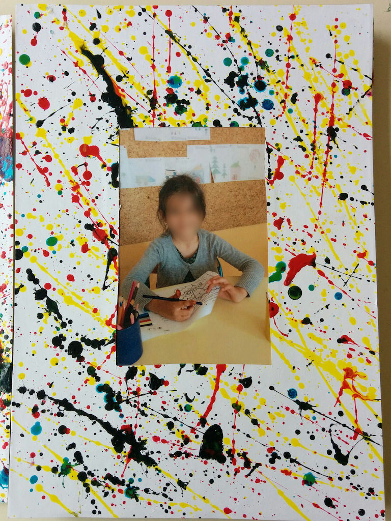 Suite à ce travail en commun, je leur ai proposé de faire un cadre photo à la manière de Jackson Pollock pour la fête des mamans. Je leur ai montré un exemple avec ma tête qui les a beaucoup fait rire et c’était parti. Je leur ai demandé de réaliser le travail en petit format (A4) en utilisant de la peinture acrylique aux couleurs plus vives (et qui évite les problèmes de la gouache qui a tendance à se re-humidifié lors du contre-collage).
