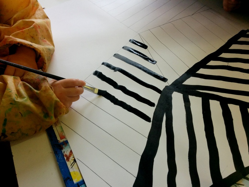 Pour les collègues de cycle 2 qui voudraient se lancer, je pense que le travail individuel sur feuille A4 est plus adapté. Restera à faire une mosaïque lors de l’affichage. A priori, je ferais quelque chose comme :