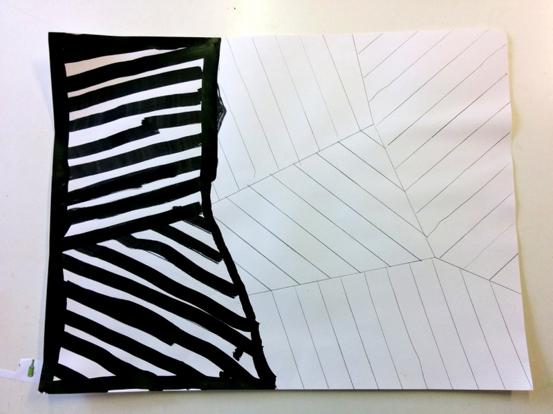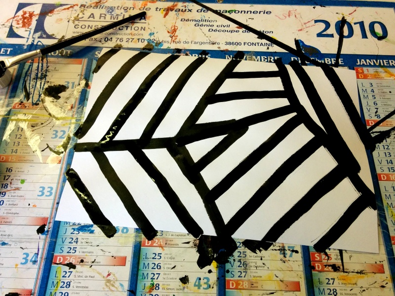 Dans en deuxième temps j’ai proposé aux élèves de réaliser une œuvre à la manière de LeWitt pour décorer le couloir de l’école. A noter que c’est plus un travail en un par un que quelque chose que l’on pourra faire en atelier avec plusieurs élèves en même temps…