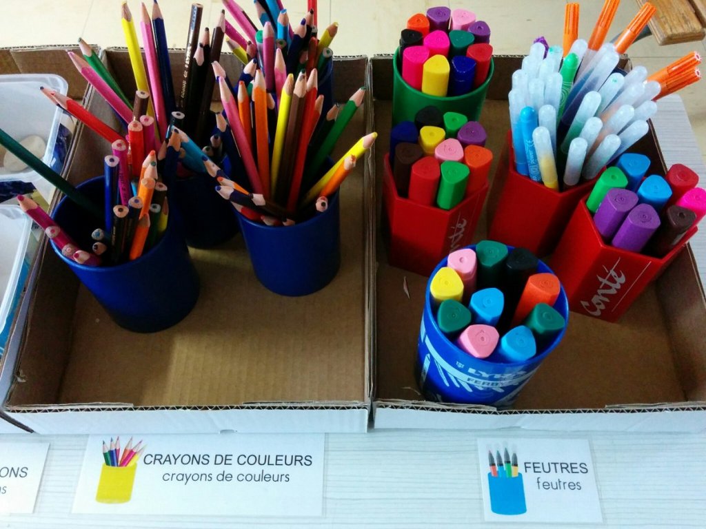 A l’usage, ça marche vraiment mieux : pour eux, ils savent où trouver les choses et où les ranger ; pour moi, quand j’ai besoin d’attraper un crayon pour écrire quelque chose, je n’ai plus besoin de traverser la classe (même si j’ai des crayons accrochés un peu partout dans la classe avec de la bande velcro).