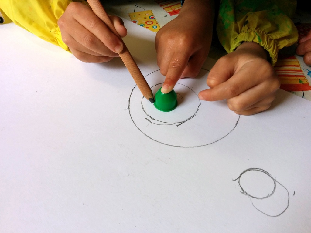 Par deux, les élève tracent leur silhouette au crayon à papier. Insister sur la position des bras – pas le long du corps, avec des « pliures ». Un travail préalable sur le tracé de contour d’objets de petits formats est à envisager au préalable. Veiller aussi à ce que les enfants ne soient pas trop serrés… le risque étant que les contours se touchent lors du passage à l’encre de chine.