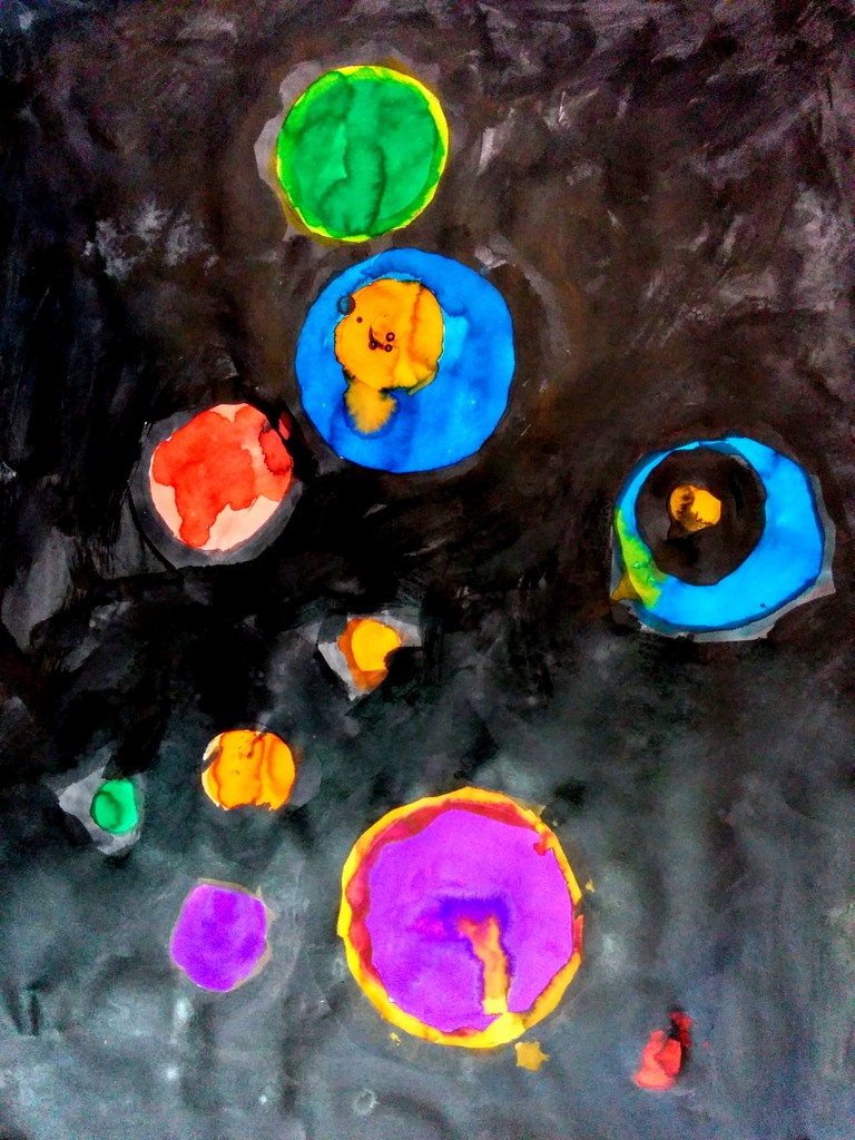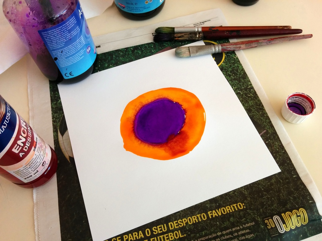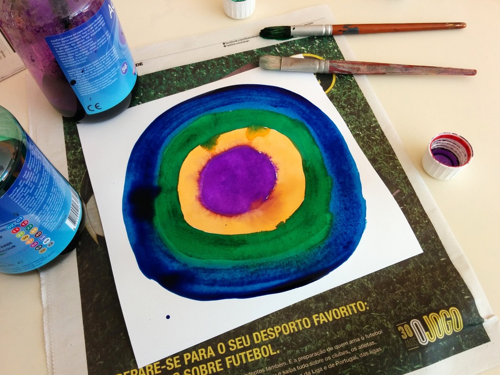 Je donne à chaque élève une barquette ou un pot de yaourt plein de la couleur qu’il a choisi. Cette opération est relativement gourmande en peinture, il faut prévoir de remplir suffisamment les pots. |