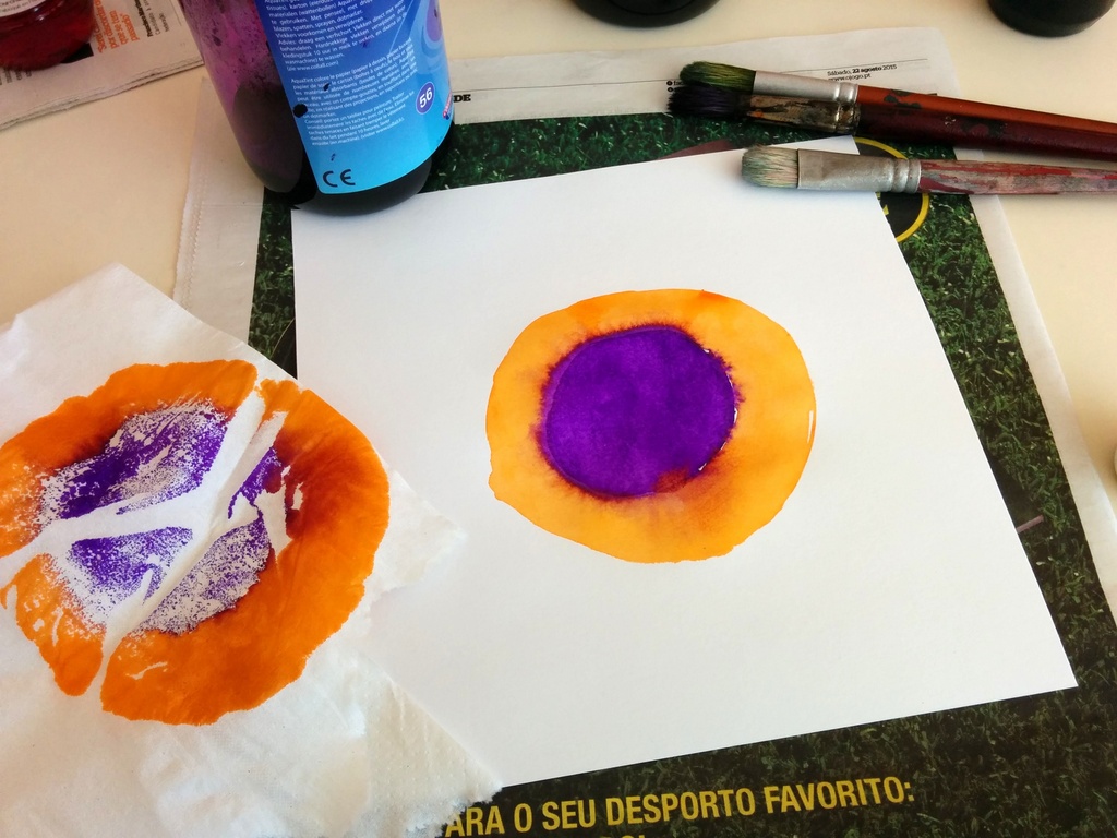 Une fois que le groupe a terminé, on travaille à l’éponge et à la gouache jaune pour faire le fond. Pas de risque de salir l’encre de chine avec la gouache ; une fois sèche (quelques minutes), l’encre de chine ne bouge plus. Attention toutefois à travailler en tamponnant et à ne pas trop charger l’éponge. L’idée ici n’est pas d’étaler la peinture mais de venir faire une empreinte d’éponge pour apporter un peu de texture. Il peut rester un peu de blanc de papier entre les empreintes d’éponge.