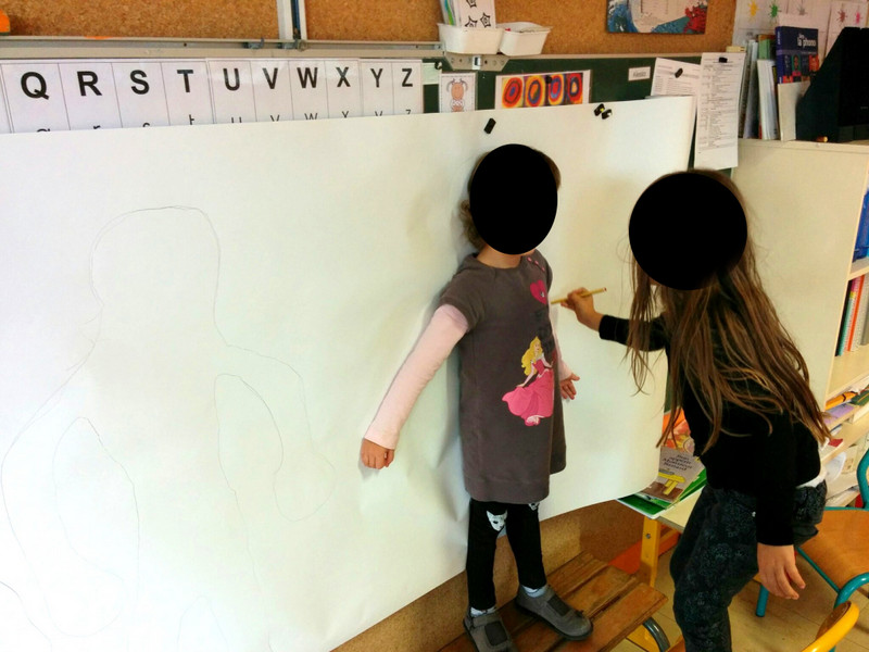 Par deux, les élève tracent leur silhouette au crayon à papier. Insister sur la position des bras – pas le long du corps, avec des « pliures ». Un travail préalable sur le tracé de contour d’objets de petits formats est à envisager au préalable. Veiller aussi à ce que les enfants ne soient pas trop serrés… le risque étant que les contours se touchent lors du passage à l’encre de chine.