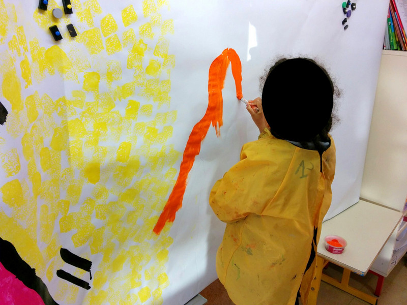 Une fois que le groupe a terminé, on travaille à l’éponge et à la gouache jaune pour faire le fond. Pas de risque de salir l’encre de chine avec la gouache ; une fois sèche (quelques minutes), l’encre de chine ne bouge plus. Attention toutefois à travailler en tamponnant et à ne pas trop charger l’éponge. L’idée ici n’est pas d’étaler la peinture mais de venir faire une empreinte d’éponge pour apporter un peu de texture. Il peut rester un peu de blanc de papier entre les empreintes d’éponge.